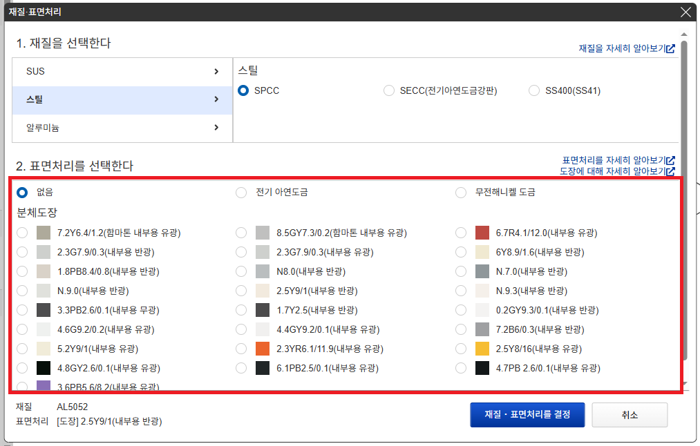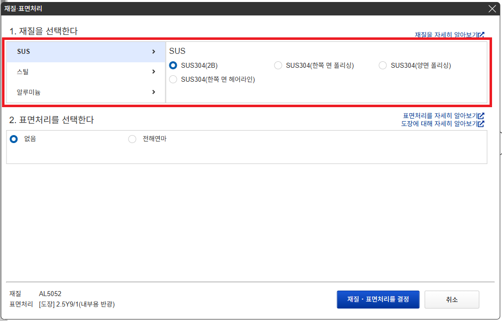 클릭하시게 되면 재질·표면 처리를 선택하실 수 있는 창이 열립니다.
