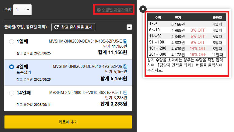 [수량별 차등가격표]에서 수량별 가격과 납기를 확인할 수 있습니다.