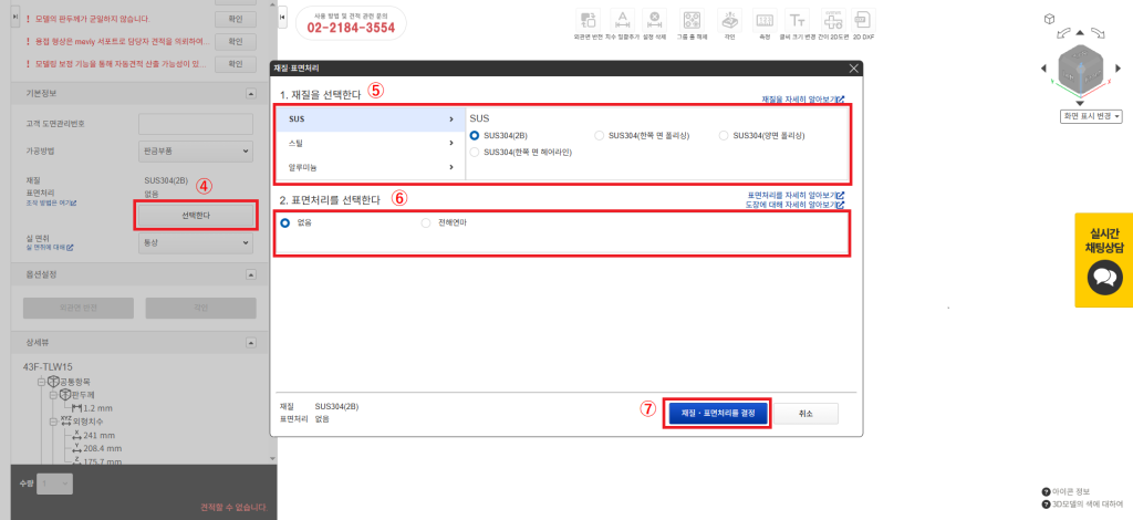 좌측 기본 정보 설정창에서 재질 및 표면처리 설정까지 내려옵니다.