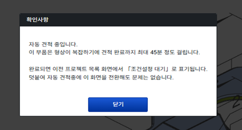 형상 가공이 포함된 파츠는 AI가 가공 가능성과 최적의 가공성을 판단하는 과정에서 형상 난이도에 따라 약 5분에서 최대 45분까지 분석 시간이 소요될 수 있습니다.