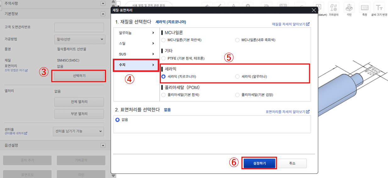 좌측 기본 정보 설정창에서 재질 및 표면처리 설정까지 내려옵니다.