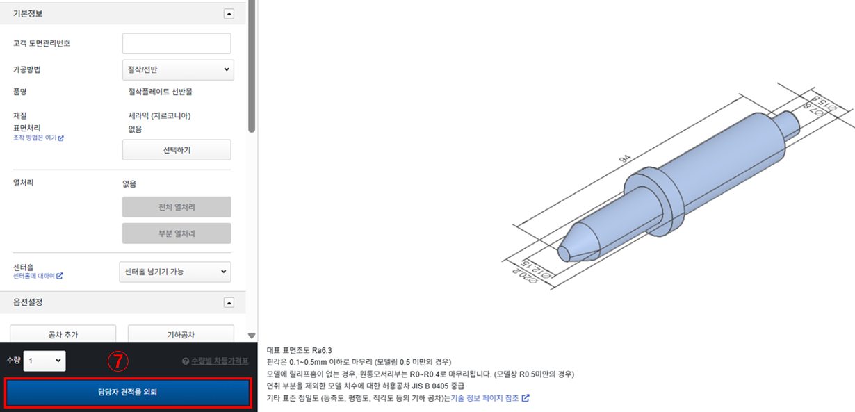 세라믹(지르코니아·알루미나) 선반 가공은 meviy → 가공방법「선반」선택 → 소재 선택 → 「담당자 견적」 의뢰(UIUX 선택)로 접수하시면 됩니다.