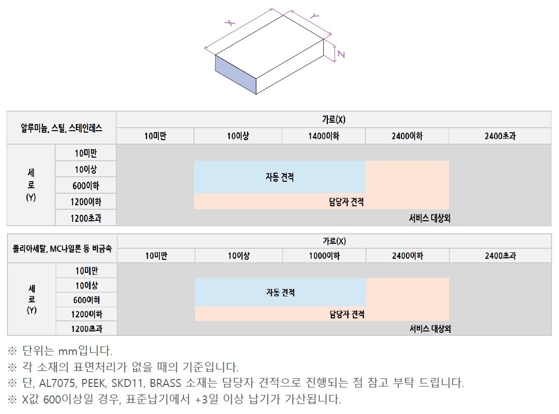재질 표면처리 표준 출하일 단납기 출하일 장납기 출하일 AL6061 AL5052